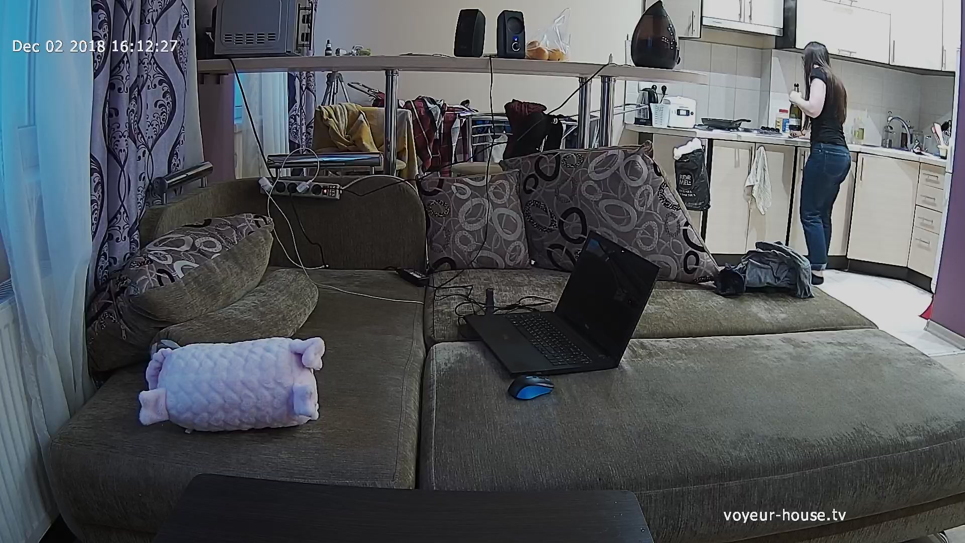 I check camera placed in the living room and discover two winsome tenants sitting there. They eat some fruits and soon take off clothes so I could appreciate their young bodies dressed in sexy lingerie.